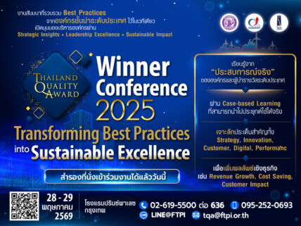 TQA Training Program 2026 สำนักงานรางวัลคุณภาพแห่งชาติ ขอเชิญองค์กรและผู้ที่สนใจเข้าอบรมหลักสูตรการฝึกอบรมรางวัลคุณภาพแห่งชาติ ประจำปี 2569 เพื่อพัฒนาองค์กรและบุคลากรสู่ความเป็นเลิศตามแนวทางรางวัลคุณ...